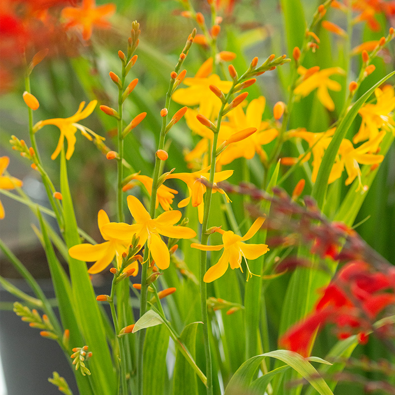 With its unique, funnel-shaped flowers in yellow, the small-flowered Montbretia 'George Davison' attracts all eyes. The yellow Crocosmia lets its flowers shine between July and September. The green, narrow foliage makes Crocosmia x crocosmiiflora 'George Davison' a unique summer bloomer. The upright growing Montbretia will grow to a height of about 50-70 cm. This yellow summer bloomer prefers a semi-shady spot in the garden and is also a real eye-catcher in containers or balcony pots. This Montbretia, suitable as a cut flower, will also enrich your summer bouquet with its yellow flowers.