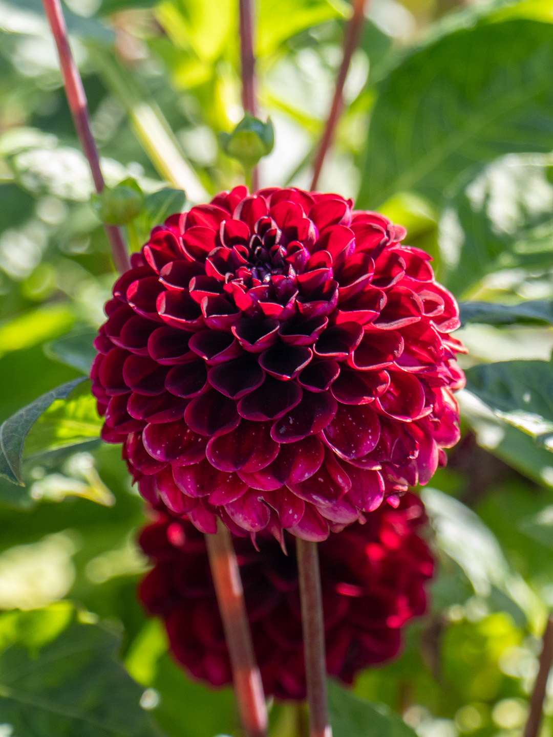 Dahlia Dark Spirit is a standout with its dark red velvety flowers. This pompon dahlia has flowers about 8-10 cm. across and combines very nicely with many other dahlias. The many flowers attract bees and butterflies.
