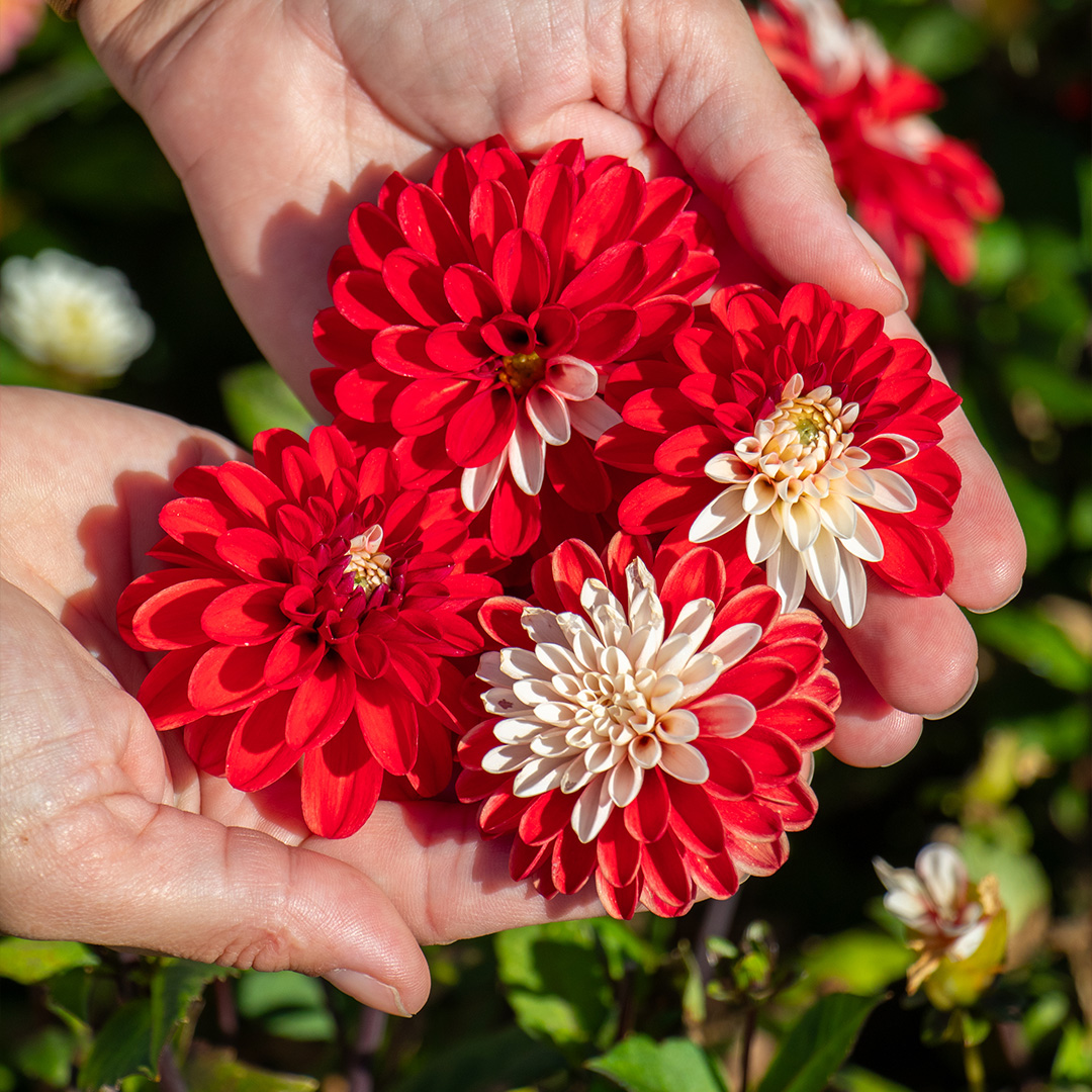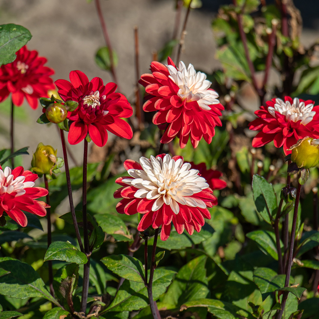 The Dahlia 'Santa Claus' is a spectacular eye-catcher that lives up to its name. This decorative dahlia stands out with its large, double flowers in a playful combination of red and white. Each petal is uniquely striped or spotted, so no two flowers are exactly alike. Perfect for those who want something special in their garden!