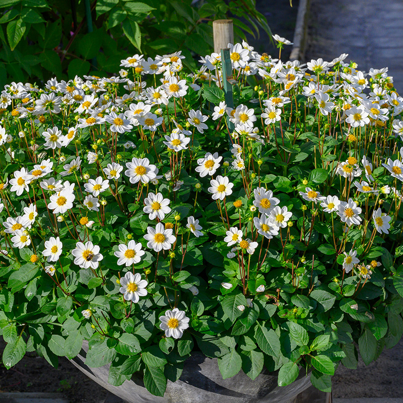 This impressive dahlia Topmix Bambino is very different from other dahlias because of its special petals. The oval, white petals with a yellow heart make this unfilled dahlia something very special. With its fresh appearance, it transforms any garden into something spectacular. This unfilled dahlia is perfect for planting in pots. These beautiful flowers bloom from July to October and like to be in full sun or partial shade. Opt for many different dahlias in your garden and keep the summer feeling for months.