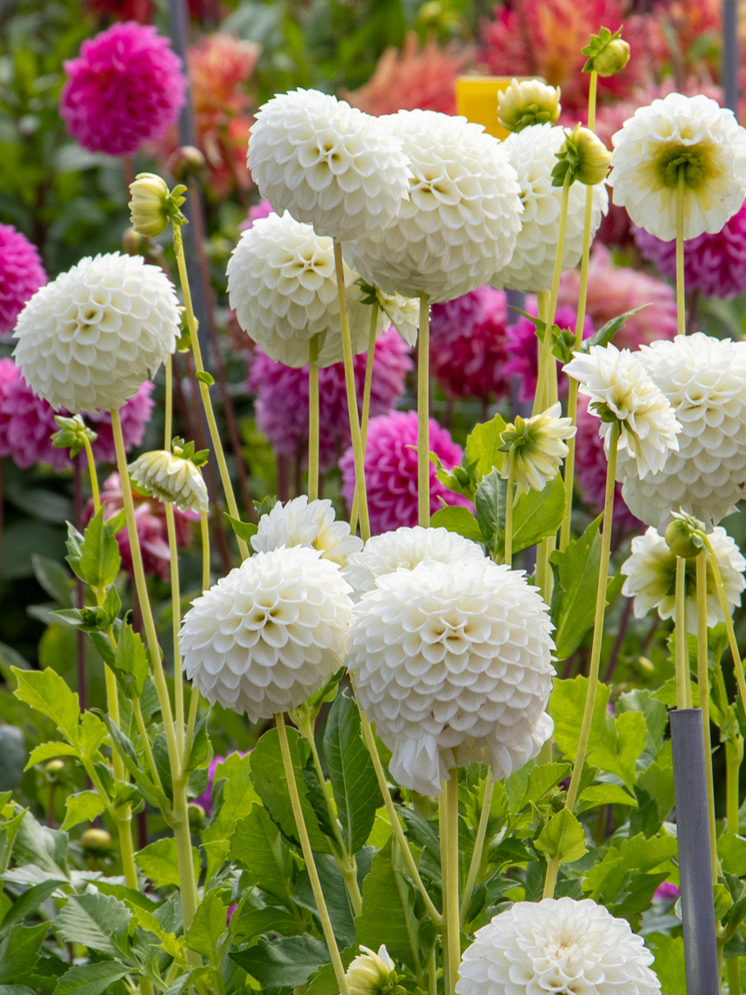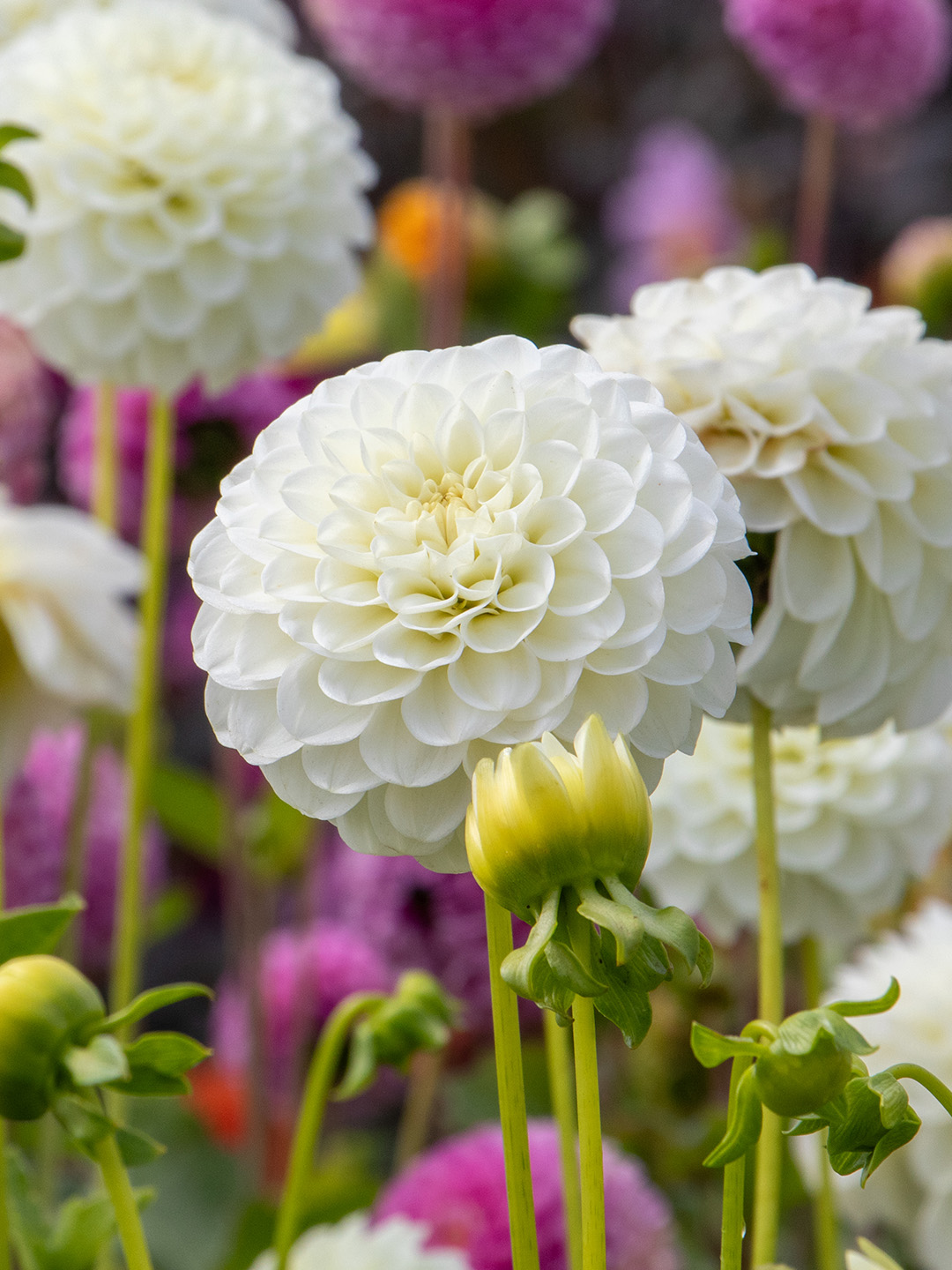 White pompom that also belongs to the older varieties. This dahlia is still widely grown and is also part of our basic range. Can be easily combined with all kinds of other colors, but also looks good in a white garden. Beautiful spherical flower shape. White Aster is a white Pompon Dahlia variety that blooms with spherical Dahlias. The dahlias bloom high on sturdy, green stems and can grow up to 110 centimeters high. The tubers produce many flowers!