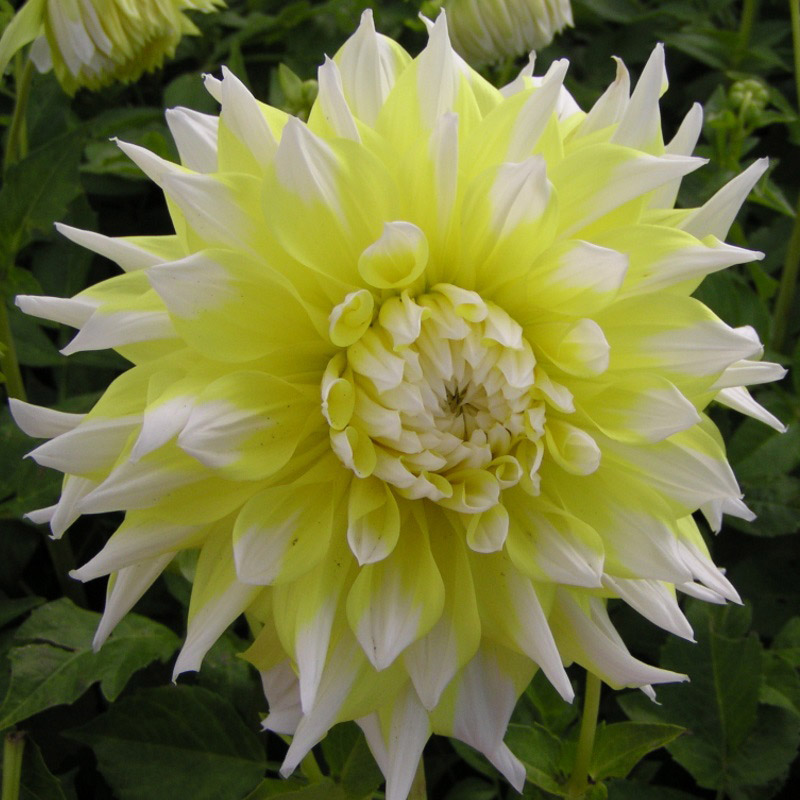 This large-flowered dahlia package consists of 3 dinner plate dahlia tubers, also called giant dahlias or super dahlias. Their flowers have a diameter of more than 20 cm, the size of a dinner plate. This giant dahlia mix consists of three different Dinnerplate dahlias. The beautiful dahlia Grand Prix presents itself with lemon yellow leaves and a flower diameter of 22cm. A beautiful white border makes each petal look perfect. An unparalleled beauty that impresses everyone, this flower has a great appearance with its lush shapes. The Dahlia X Factor® is beautiful with its red and white petals and really impresses everyone. This decorative dahlia has a powerful appearance that should not be missing in any garden. The flower diameter of this super dahlia is 20cm. The Frost Nip dahlia completes the large-flowered Dahlia Mix with its orange petals with white edges. This giant dahlia also has a diameter of 22cm.