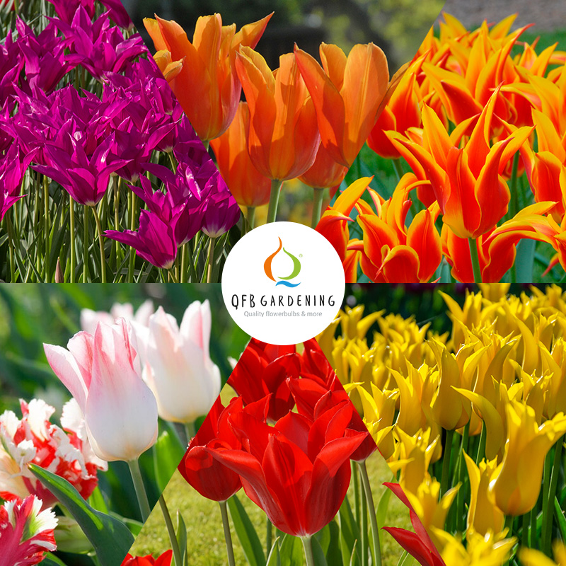 With our lily-flowering tulip mix you can bring an elegant tulip combination into your home! This tulip mix looks great, especially in large groups! The lilyflowering tulips in various colours from purple, yellow, pink to red have elegant, unfilled, cup-shaped flowers that bloom in late spring, between April and May. Lily-flowering tulips have a particularly thin style that makes them look even more elegant. For this tulipbulb collection, we have combined height groups between 30 cm and 70 cm so that the bulb mix creates a loose garden look of different colours and heights. Plant this fantastic mix in your garden for a cheerful colour combination and enjoy the long flowering.