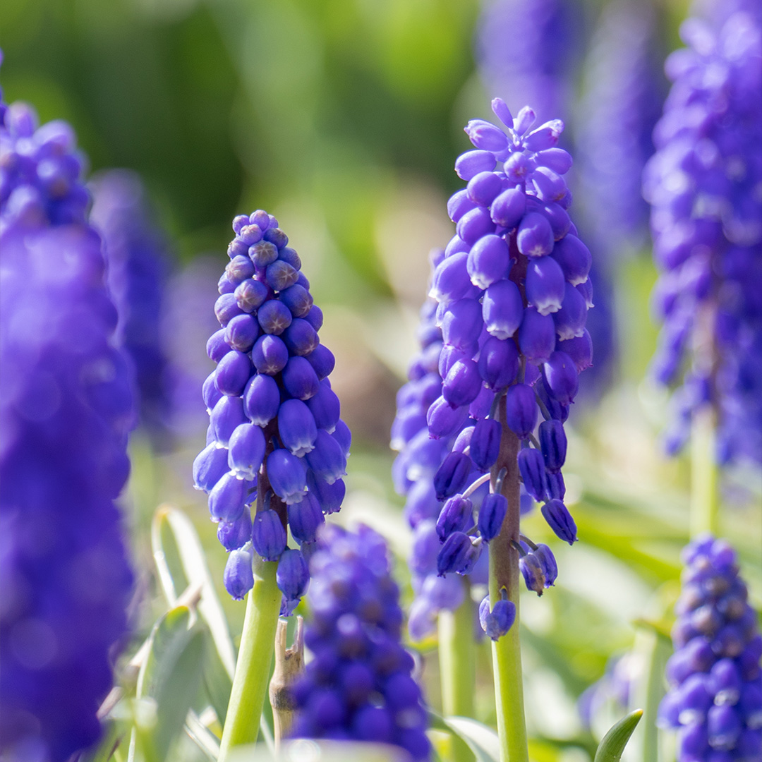 Muscari is commonly known as grape-hyacinth and it is very easy to grow, winter-sturdy flower! Muscari grows long, sturdy stems with purple, fragrant and tightly packed urn-shaped flowers that resemble grapes! The flower approves any medium-moisture soil and looks fantastic in the garden, perimeters, container, wooden pots and barrels, that have become very popular these days. To add a royal blue shade to our grape hyacinth assortment, we have chosen to add Muscari Botryoides and Muscari Armeniacum! Make sure to plant your muscari bulbs in the autumn so they can self-seed and surprise you with more and more flowers every year. The grape-hyacinths are also available in various shapes and multicolours!