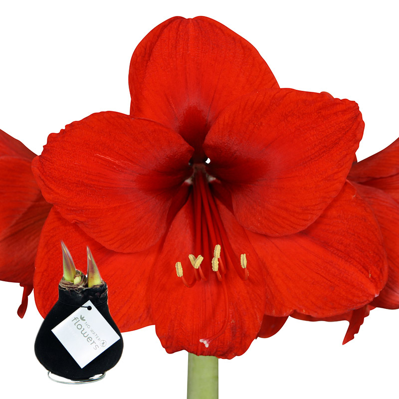 The bulbs are prepared to develop a layer of wax, so they don't need watering while still providing enough energy to produce blooms. Thanks to a special metal base under the bulb, the Wax Amaryllis won't tip over, allowing you to enjoy its beautiful flowers without worry.